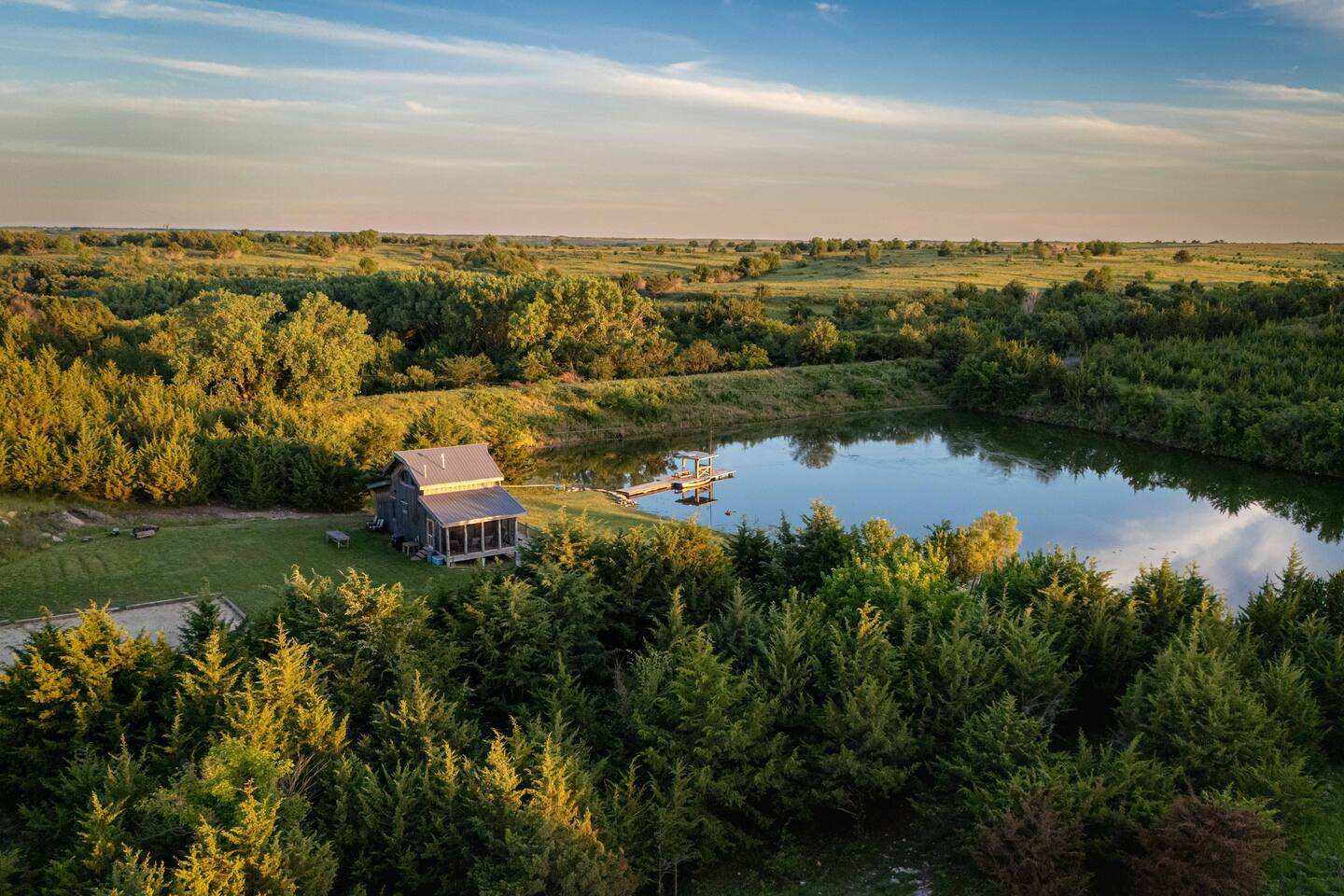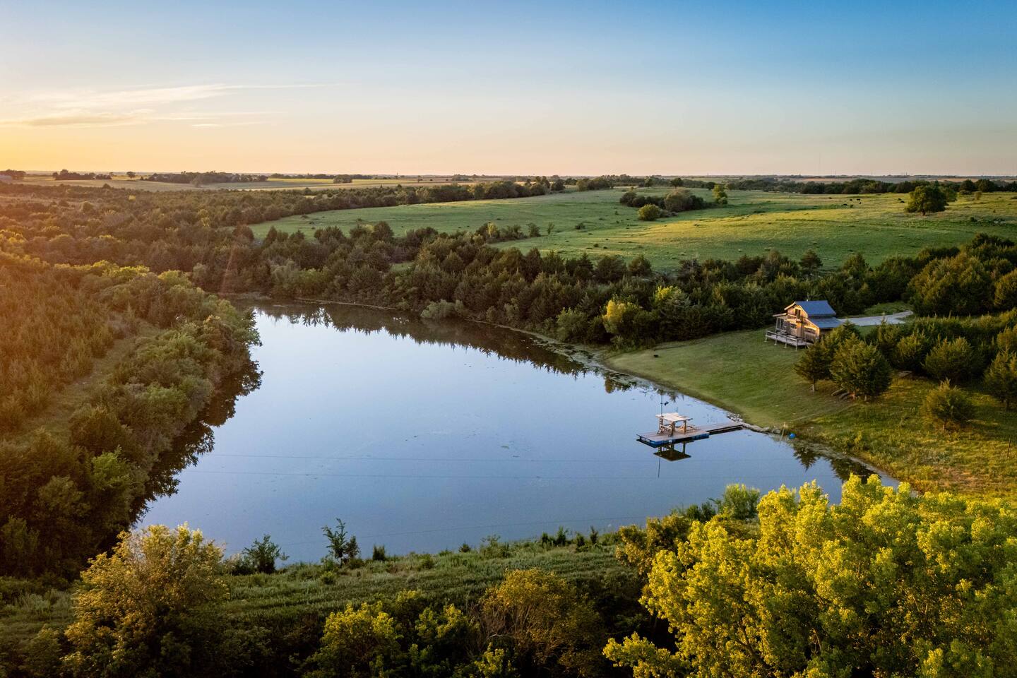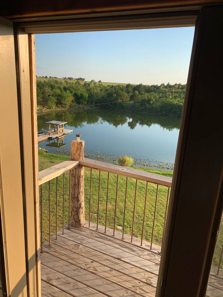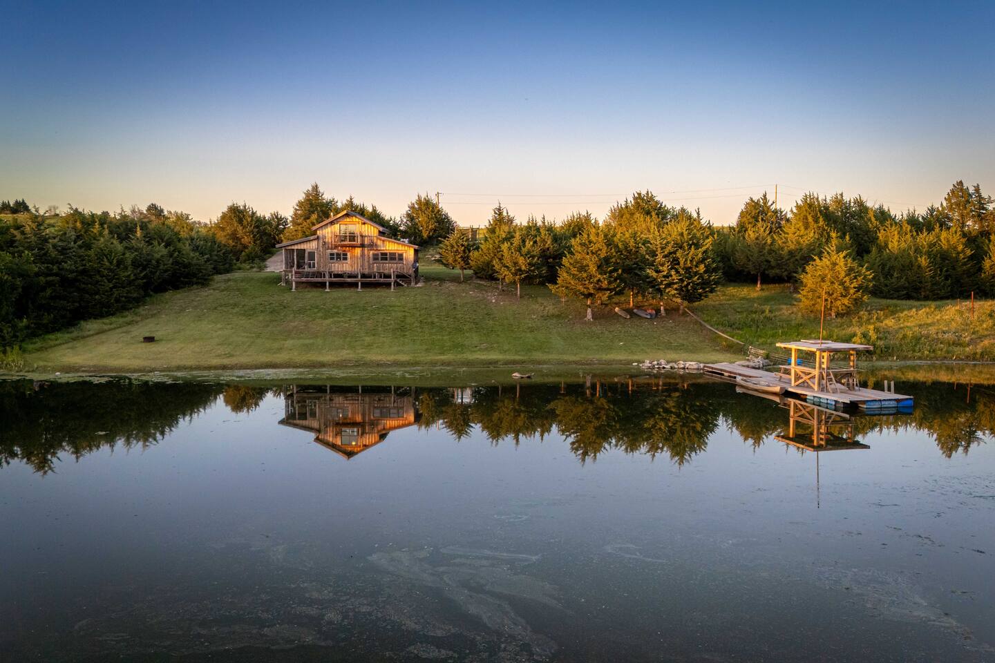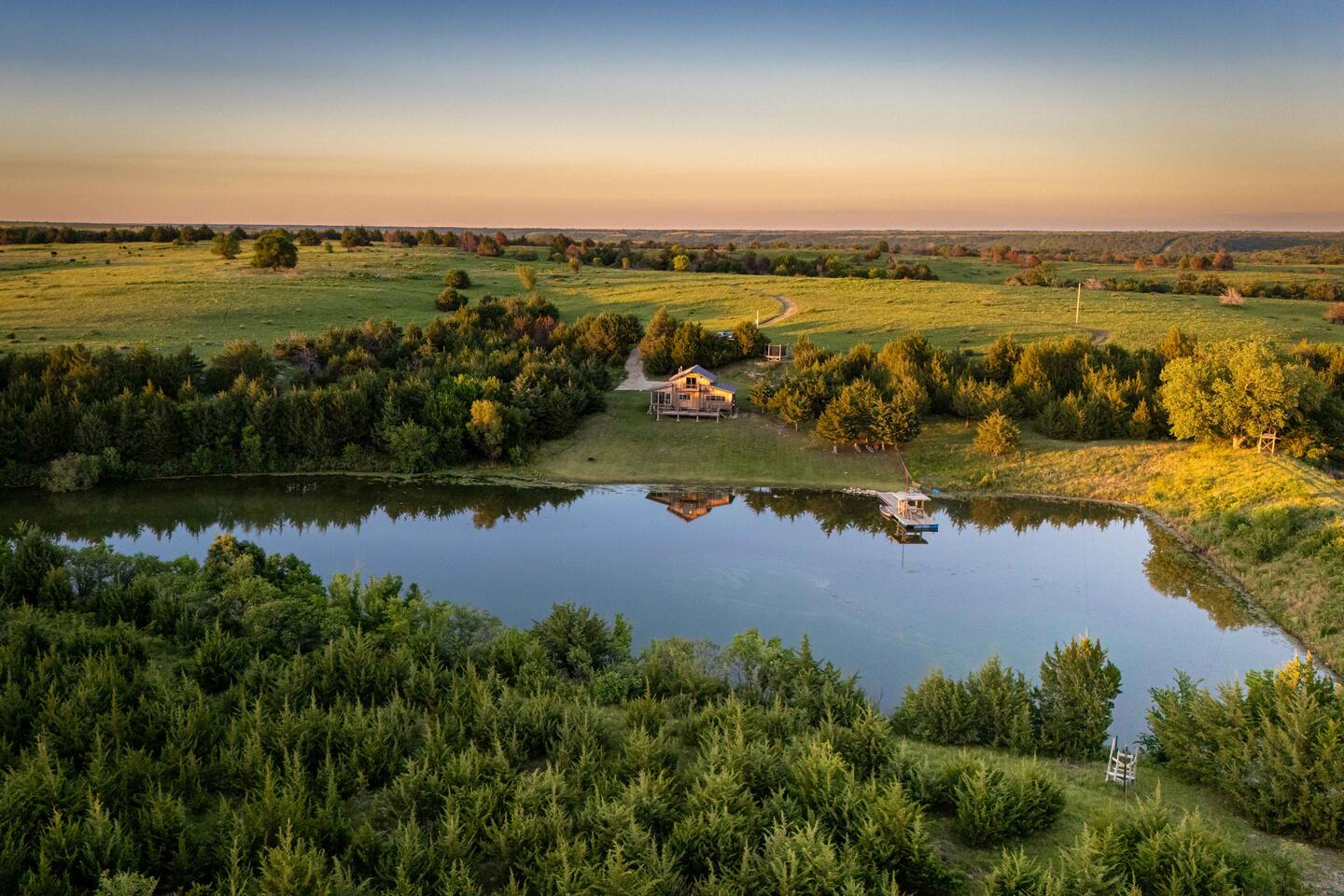 The cabin sits in the middle of 400 acres of pasture. Cattle are grazed there six months out of the year. You are welcome to roam wherever you'd like. We just ask that you stay inside the fence. The owners do live on the property, but their house is at the other end of the pasture and not visible from the cabin. Feel free to swim and fish in the pond! Catch and release fishing only, though! Life jackets MUST be worn by ALL while down on the dock and on watercraft.