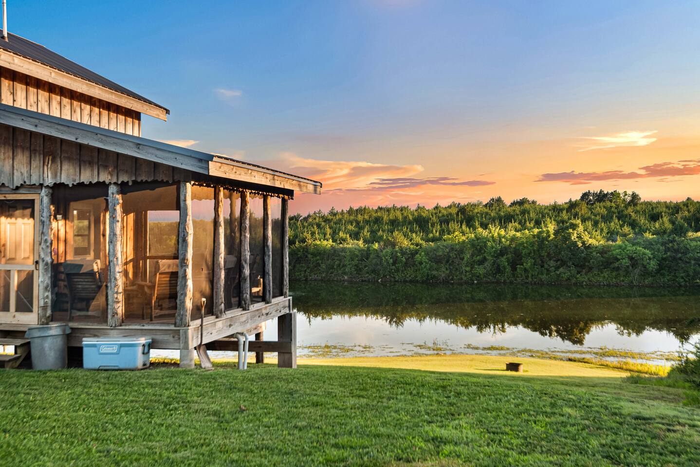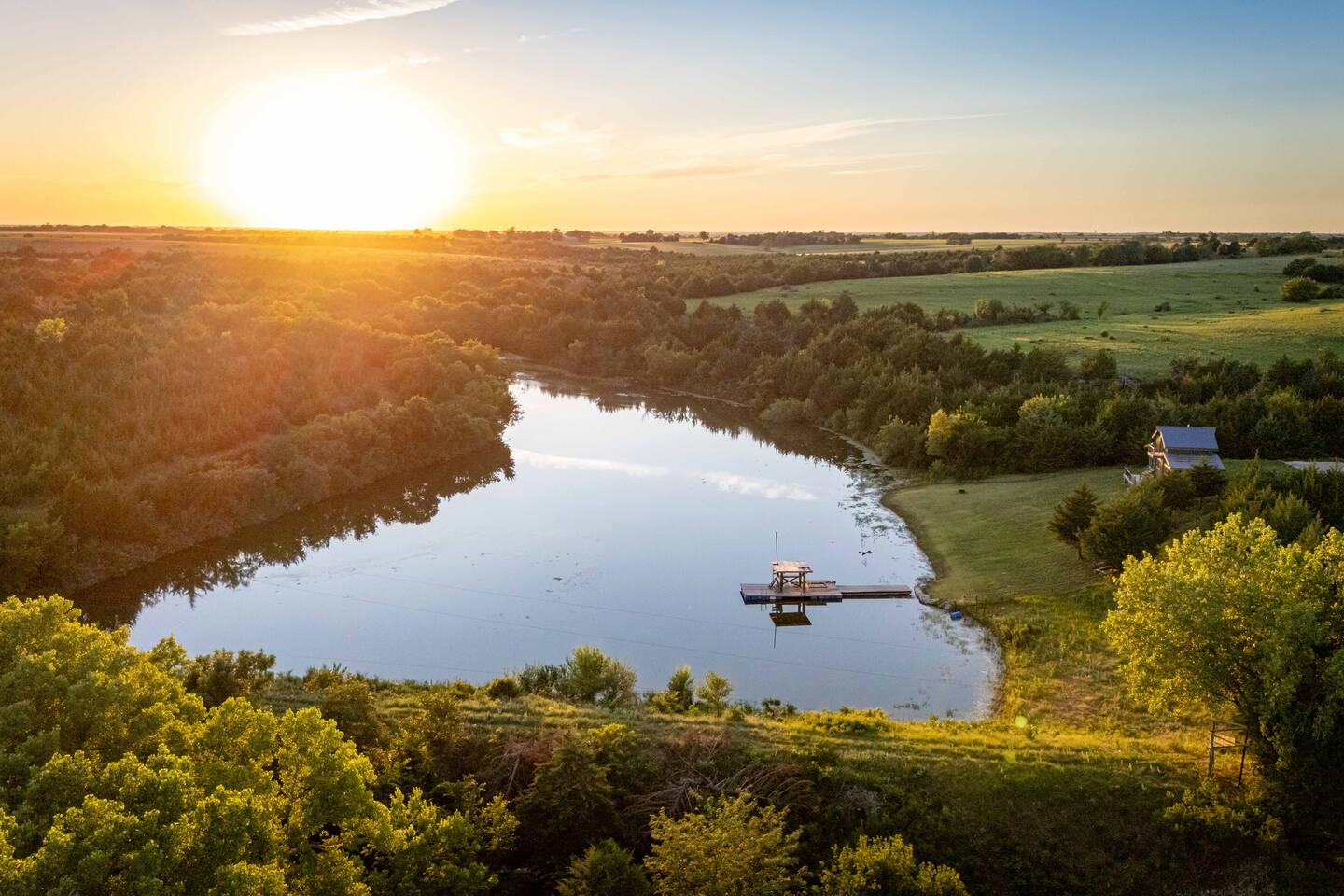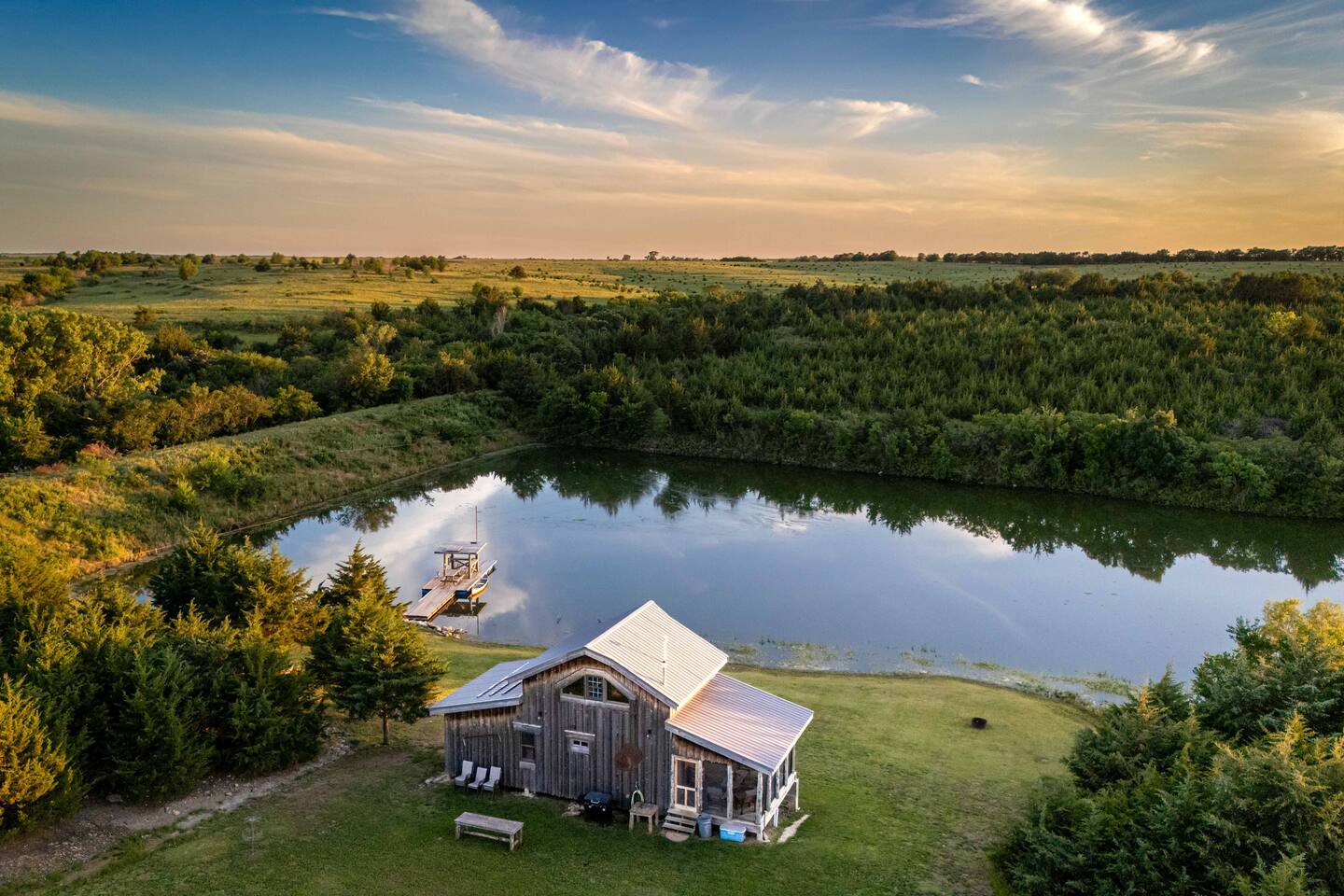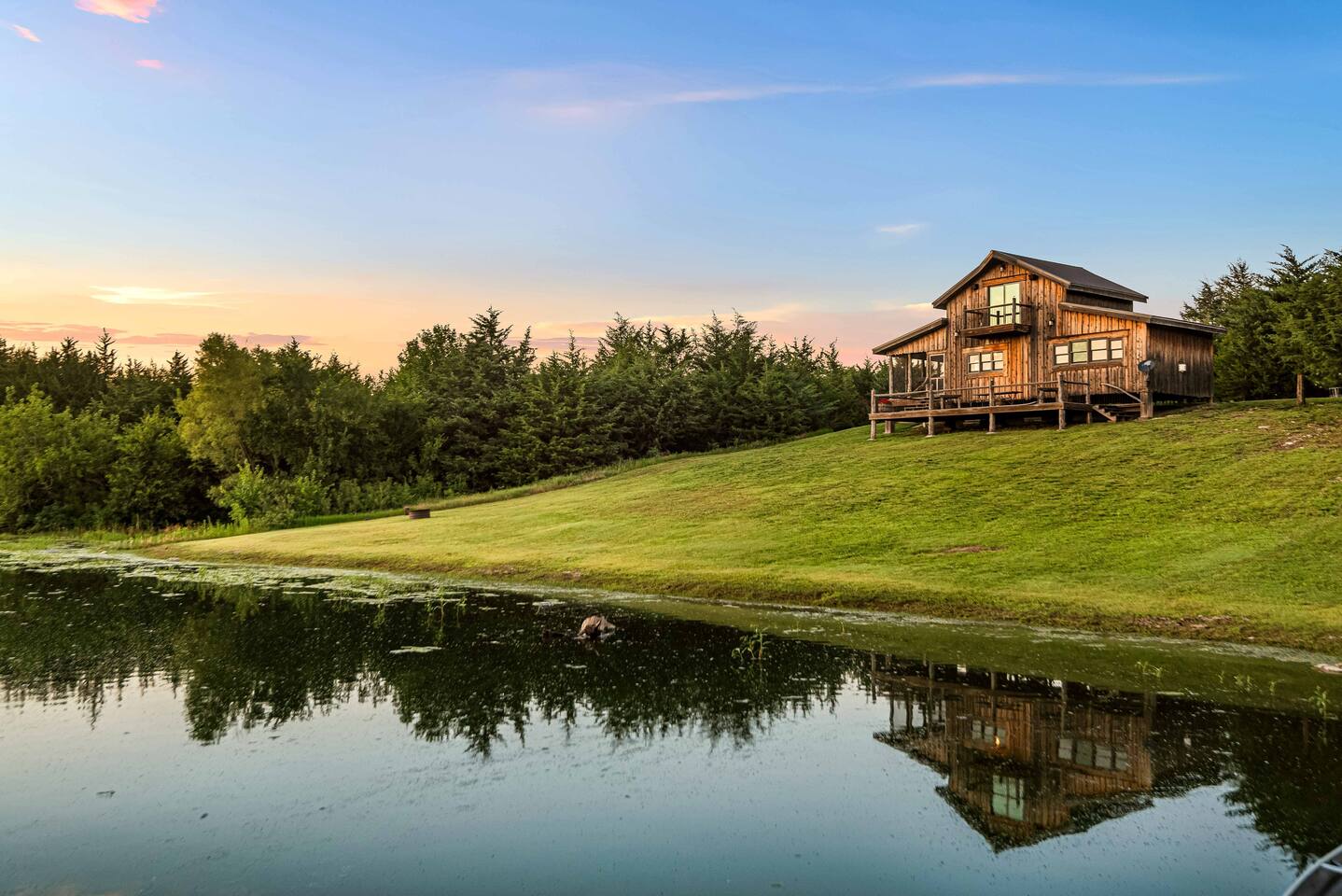 The cabin sits in the middle of 400 acres of pasture. Cattle are grazed there six months out of the year. You are welcome to roam wherever you'd like. We just ask that you stay inside the fence. The owners do live on the property, but their house is at the other end of the pasture and not visible from the cabin. Feel free to swim and fish in the pond! Catch and release fishing only, though! Life jackets MUST be worn by ALL while down on the dock and on watercraft.