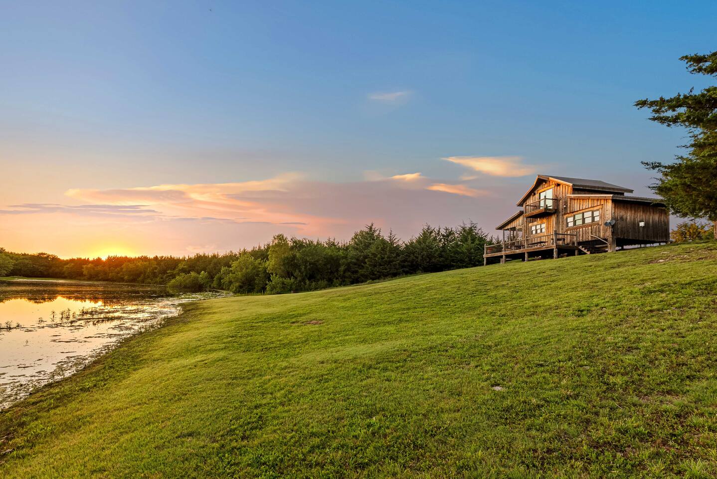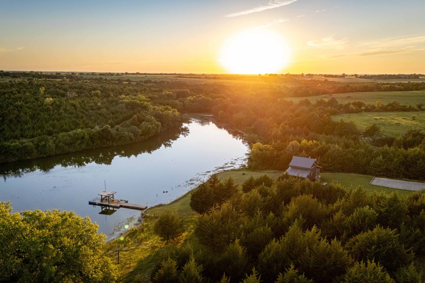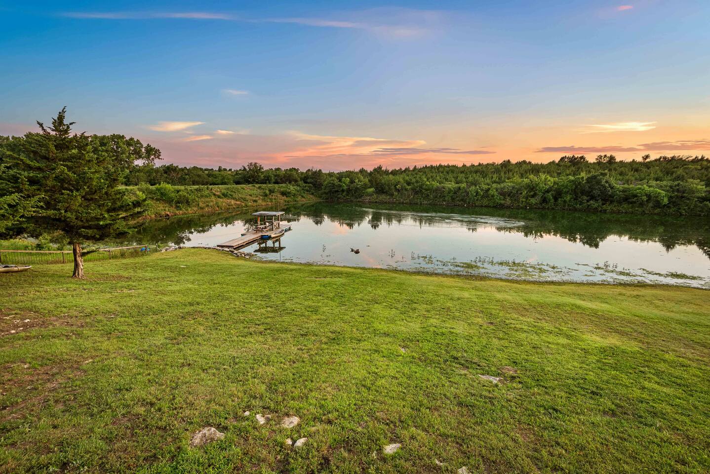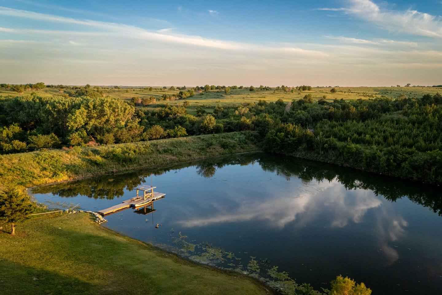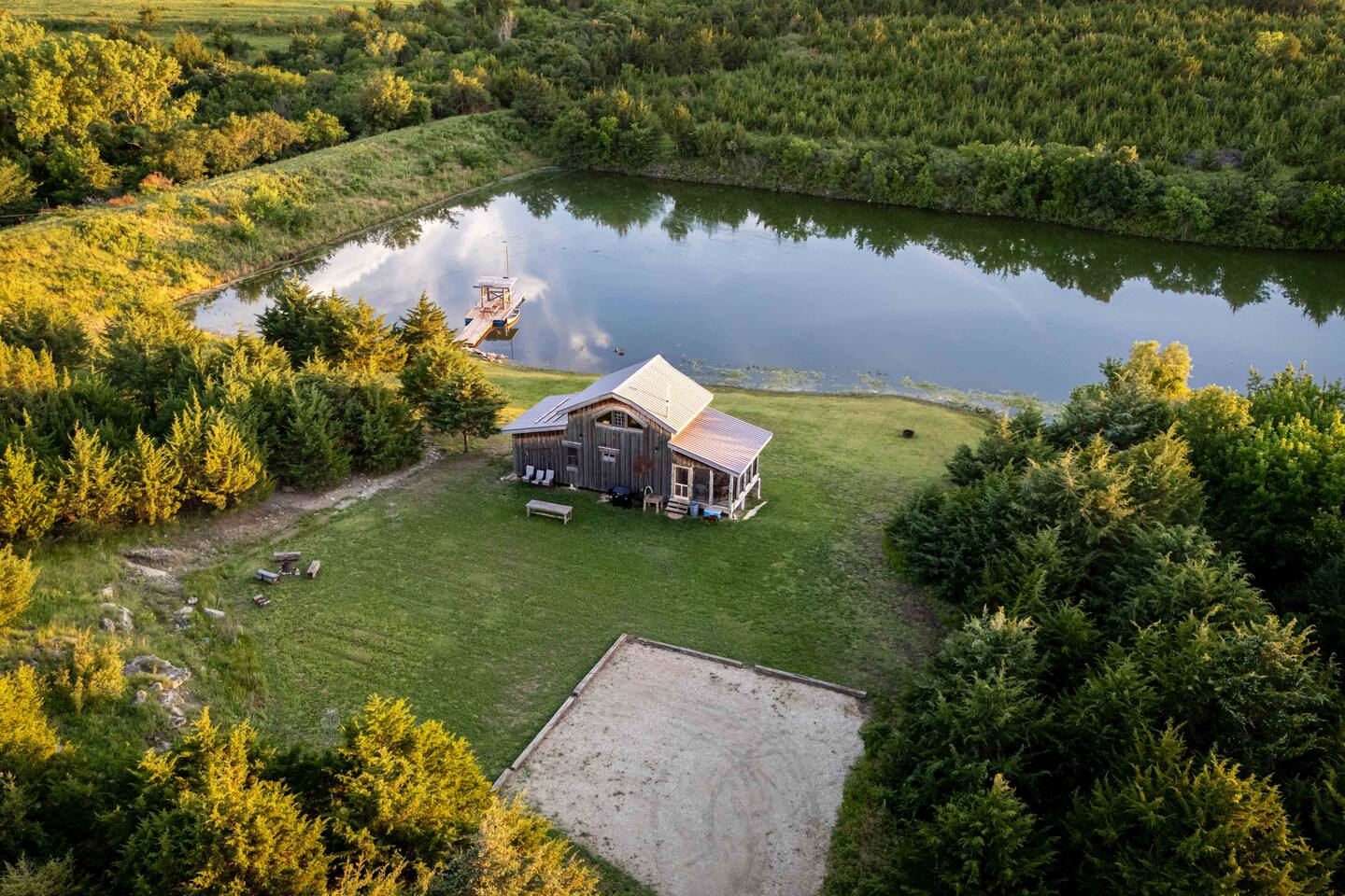 The cabin sits in the middle of 400 acres of pasture. Cattle are grazed there six months out of the year. You are welcome to roam wherever you'd like. We just ask that you stay inside the fence. The owners do live on the property, but their house is at the other end of the pasture and not visible from the cabin. Feel free to swim and fish in the pond! Catch and release fishing only, though! Life jackets MUST be worn by ALL while down on the dock and on watercraft.