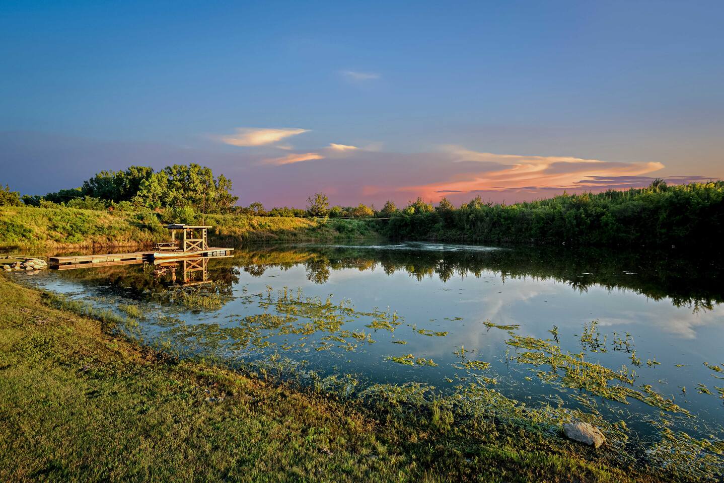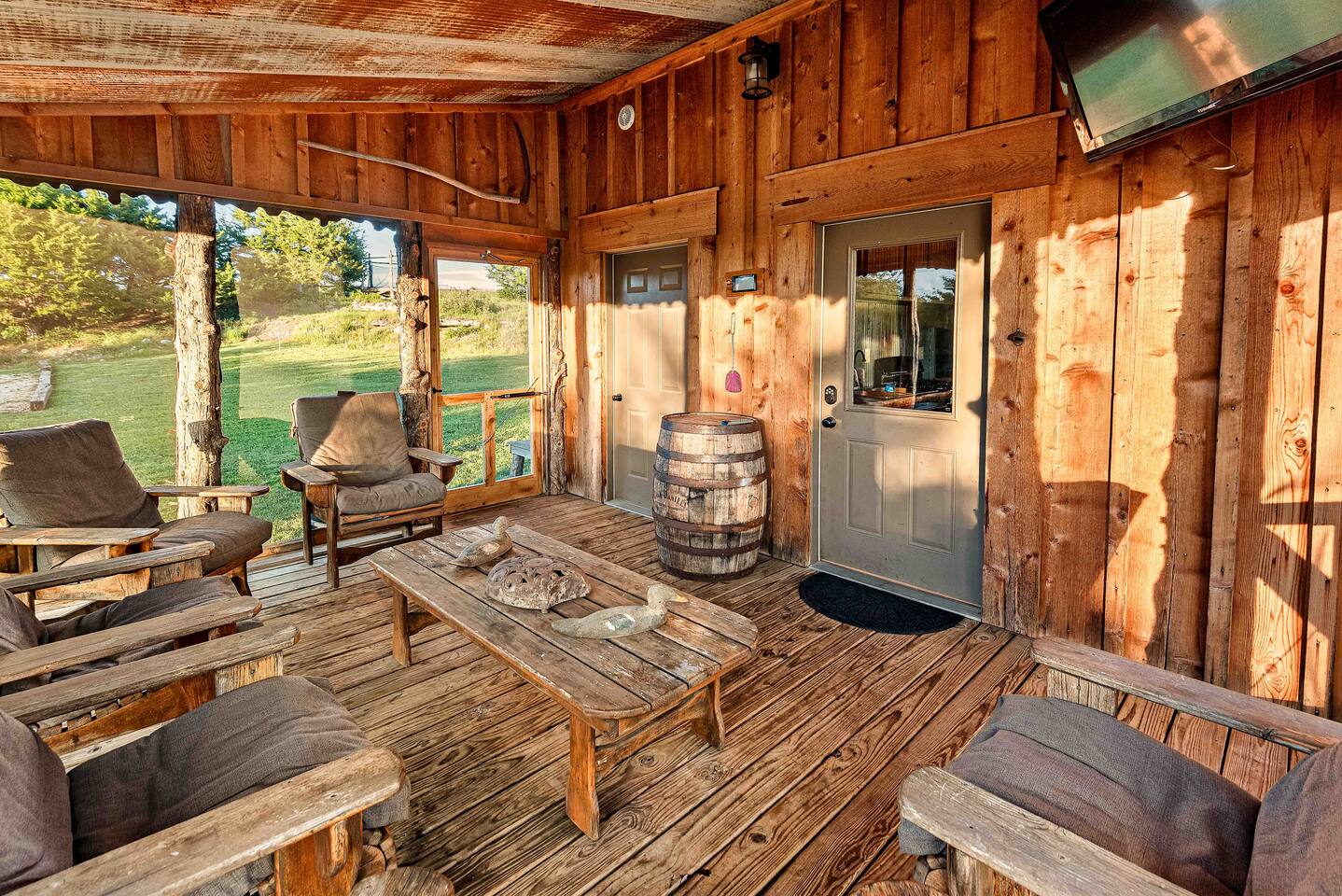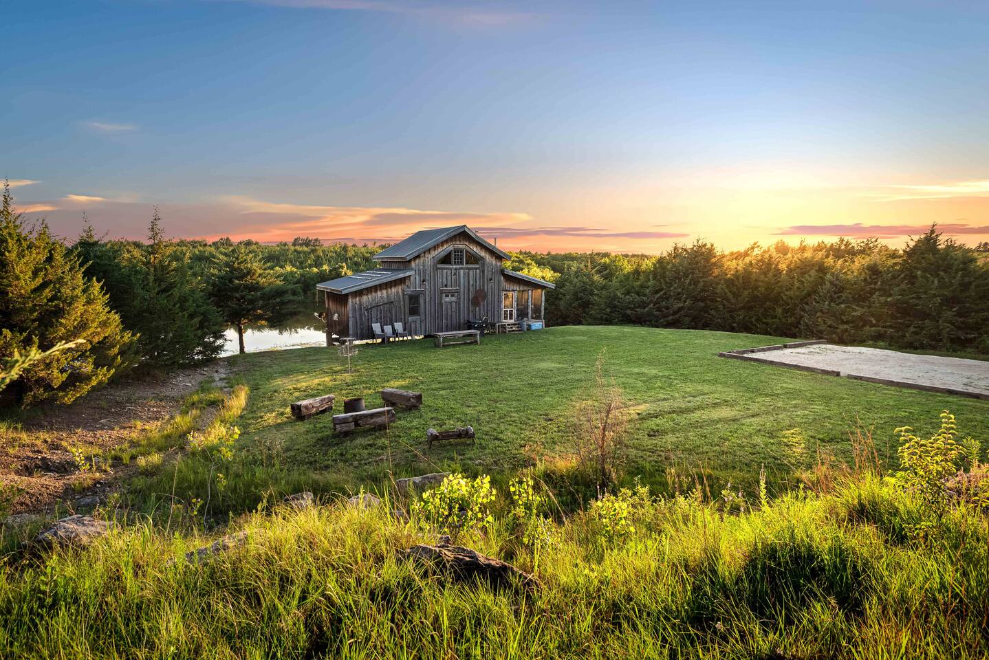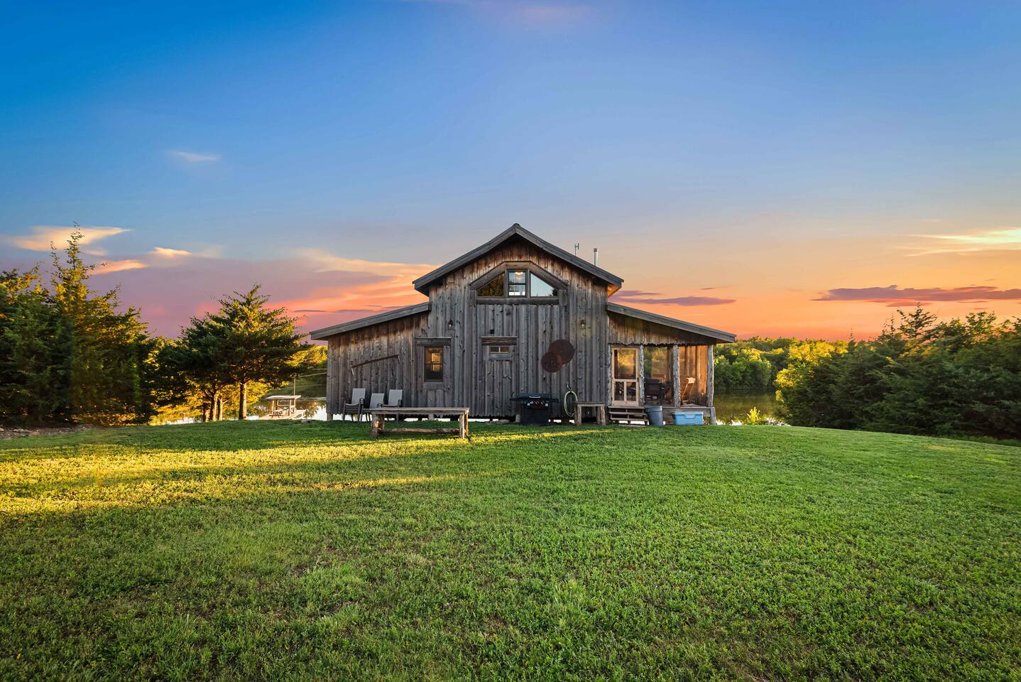 The cabin sits in the middle of 400 acres of pasture. Cattle are grazed there six months out of the year. You are welcome to roam wherever you'd like. We just ask that you stay inside the fence. The owners do live on the property, but their house is at the other end of the pasture and not visible from the cabin. Feel free to swim and fish in the pond! Catch and release fishing only, though! Life jackets MUST be worn by ALL while down on the dock and on watercraft.